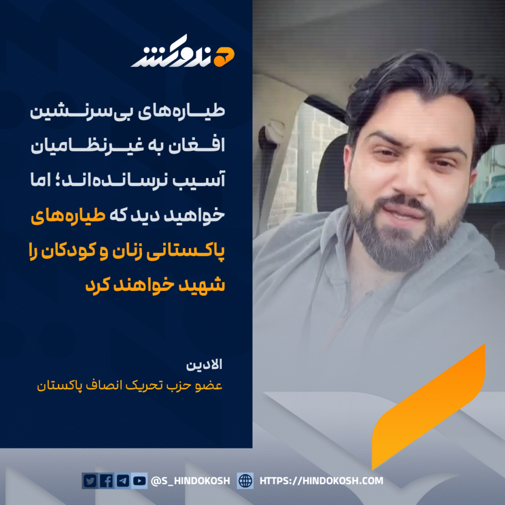 الادین، عضو حزب تحریک انصاف پاکستان: طیارههای بیسرنشین افغان به غیرنظامیان آسیب نرساندهاند؛ اما خواهید دید که طیارههای پاکستانی زنان و کودکان را شهید خواهند کرد