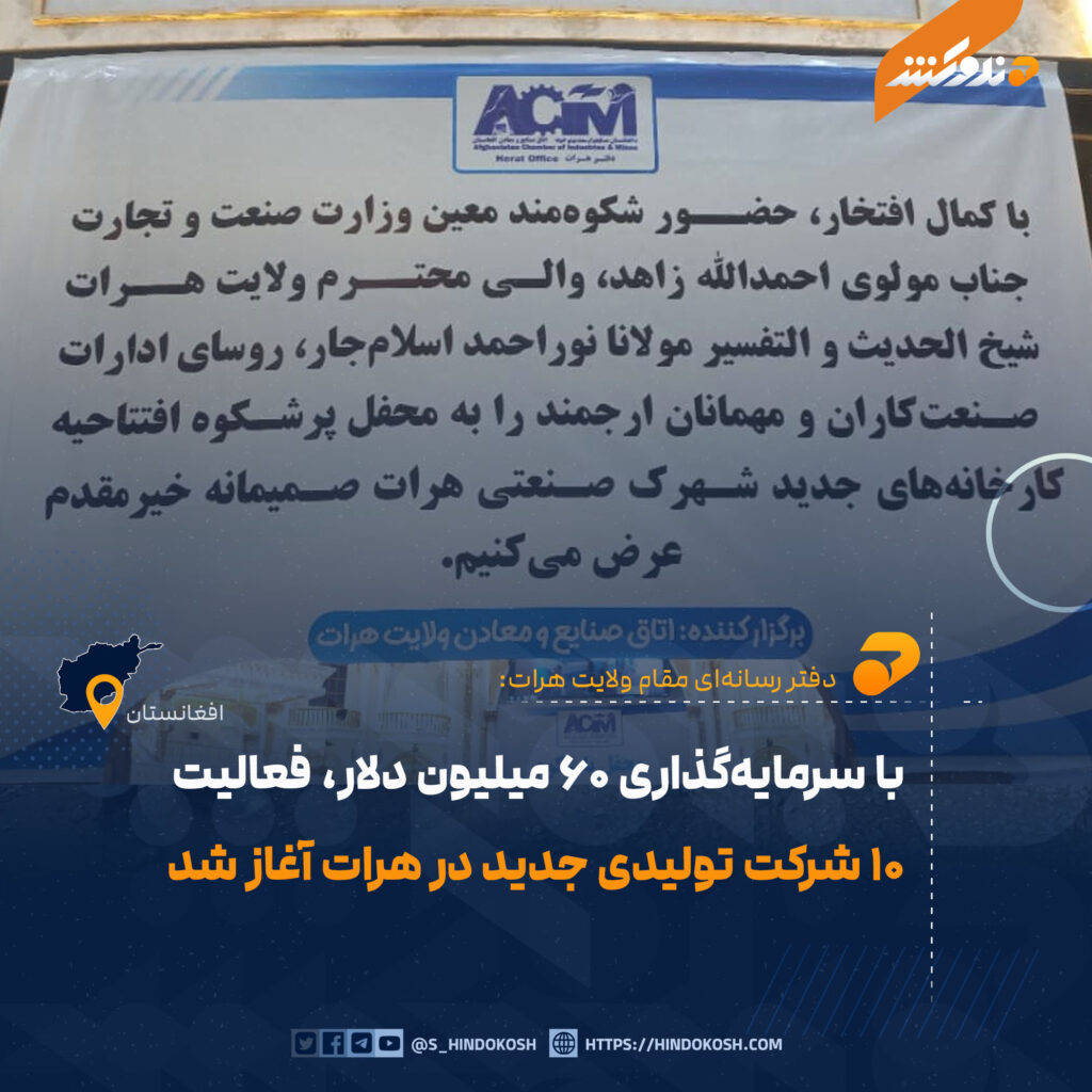 دفتر رسانهای مقام ولایت هرات خبر داده است که در شهرک صنعتی این ولایت، فعالیت ۱۰ شرکت جدید با سرمایهگذاری ۶۰ میلیون دلار آغاز شده است.
