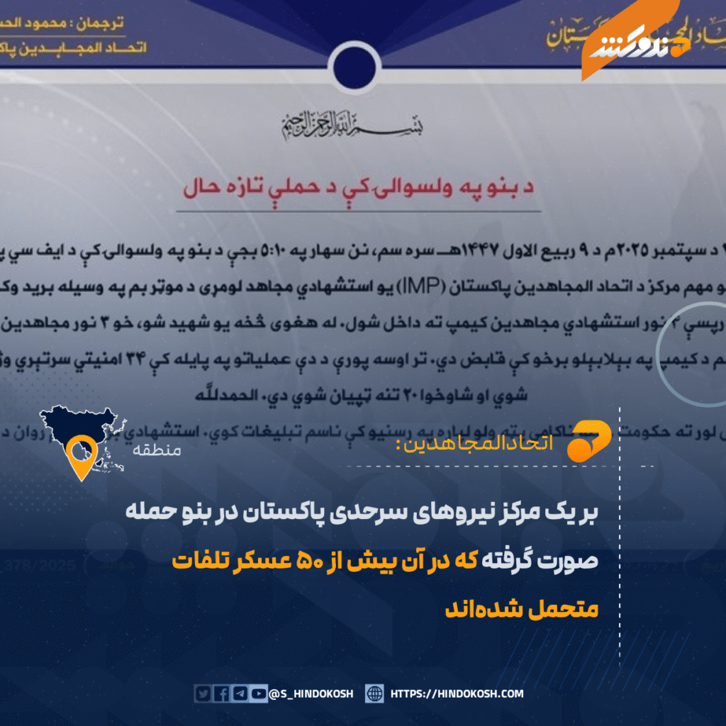 بر یک مرکز نیروهای سرحدی پاکستان در بنو حمله صورت گرفته که در آن بیش از ۵۰ عسکر تلفات متحمل شدهاند