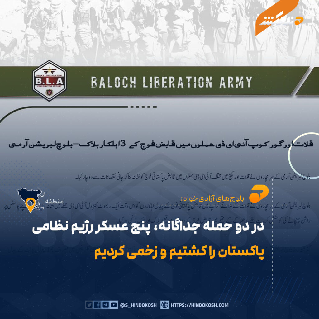 ارتش آزادی‌بخش بلوچستان (BLA) در خبرنامه‌ای اعلام کرده است که جنگجویان این گروه در دو حمله جداگانه، سه عسکر رژیم نظامی پاکستان را کشته و دو تن دیگر را زخمی کرده‌اند.