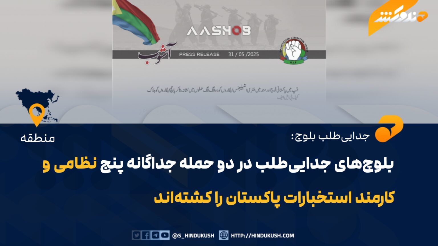 گروه جدایی‌طلب بلوچ (BLF) با نشر یک اعلامیه گفته است که افراد مسلح این گروه در ولسوالی‌های تمپ و مند ایالت بلوچستان، دو حمله جداگانه بر نیروهای نظامی و کارمندان استخباراتی پاکستان انجام داده‌اند که در نتیجه آن ۵ تن کشته شده‌اند.