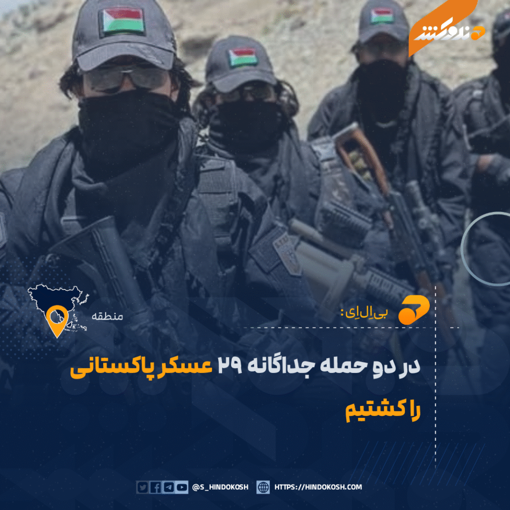 گروه جداییطلب بلوچ موسوم به «بیاِلاِف» (جبهه آزادیبخش بلوچ) با نشر یک خبرنامه اعلام کرده است که جنگجویان این گروه در دو حمله جداگانه ۲۹ عسکر پاکستانی را کشته و ۷ تن دیگر را زخمی کردهاند.