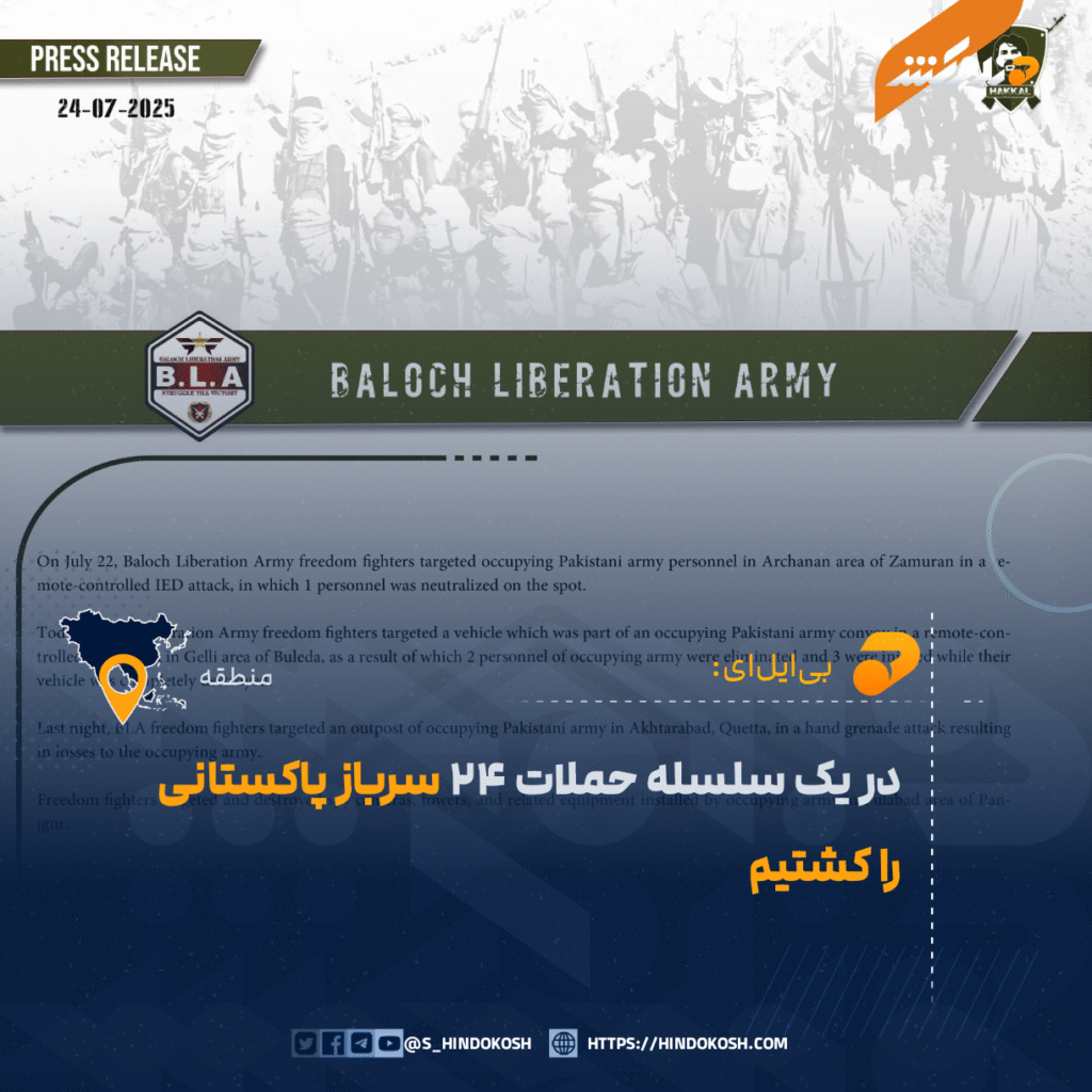 شبه‌نظامیان گروه جدایی‌طلب بلوچ (بی‌ایل‌ای) ۱۲ حمله جداگانه بر نظامیان پاکستانی در مناطق مختلف ایالت بلوچستان انجام داده‌اند که در نتیجه آن ۲۴ سرباز پاکستانی به شمول یک میجر کشته شدند.