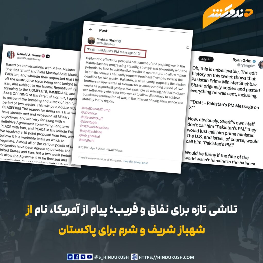 پیام شهباز شریف، نخست‌وزیر پاکستان، که در آن از دونالد ترامپ خواسته بود تهدیدها مبنی بر نابودی ایران را به تعویق بیندازد، روز سه‌شنبه پس از آن با انتقادات شدیدی روبه‌رو شد که کاربران شبکه‌های اجتماعی نشان دادند پیش‌نویس اولیه توئیت او به نظر می‌رسد توسط نهادی خارج از پاکستان (آمریکا) نوشته شده باشد.