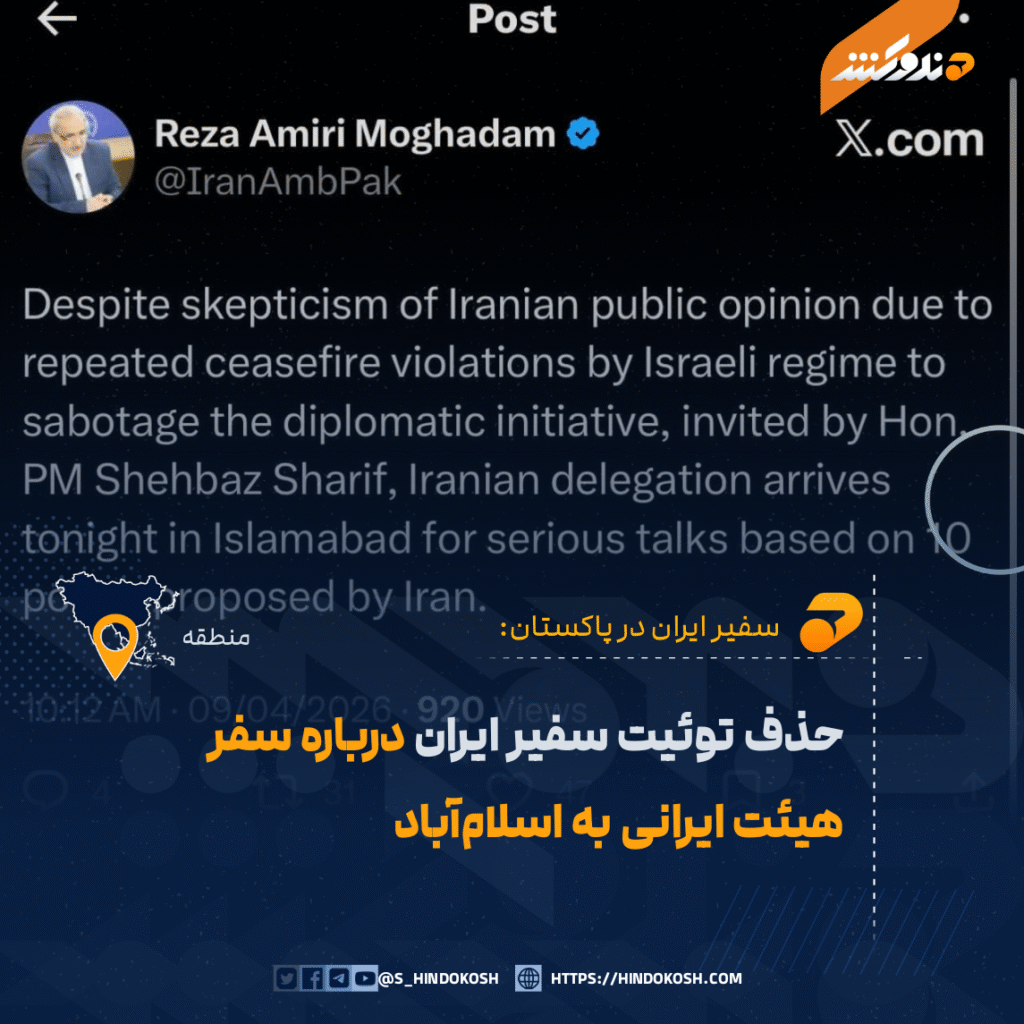 رضا امیری مقدم، سفیر ایران در پاکستان، توئیت خود را که در آن گفته بود امشب هیئتی ایرانی برای گفتگو با طرف آمریکایی درباره مفاد آتش‌بس به اسلام‌آباد سفر می‌کند، حذف کرده است.