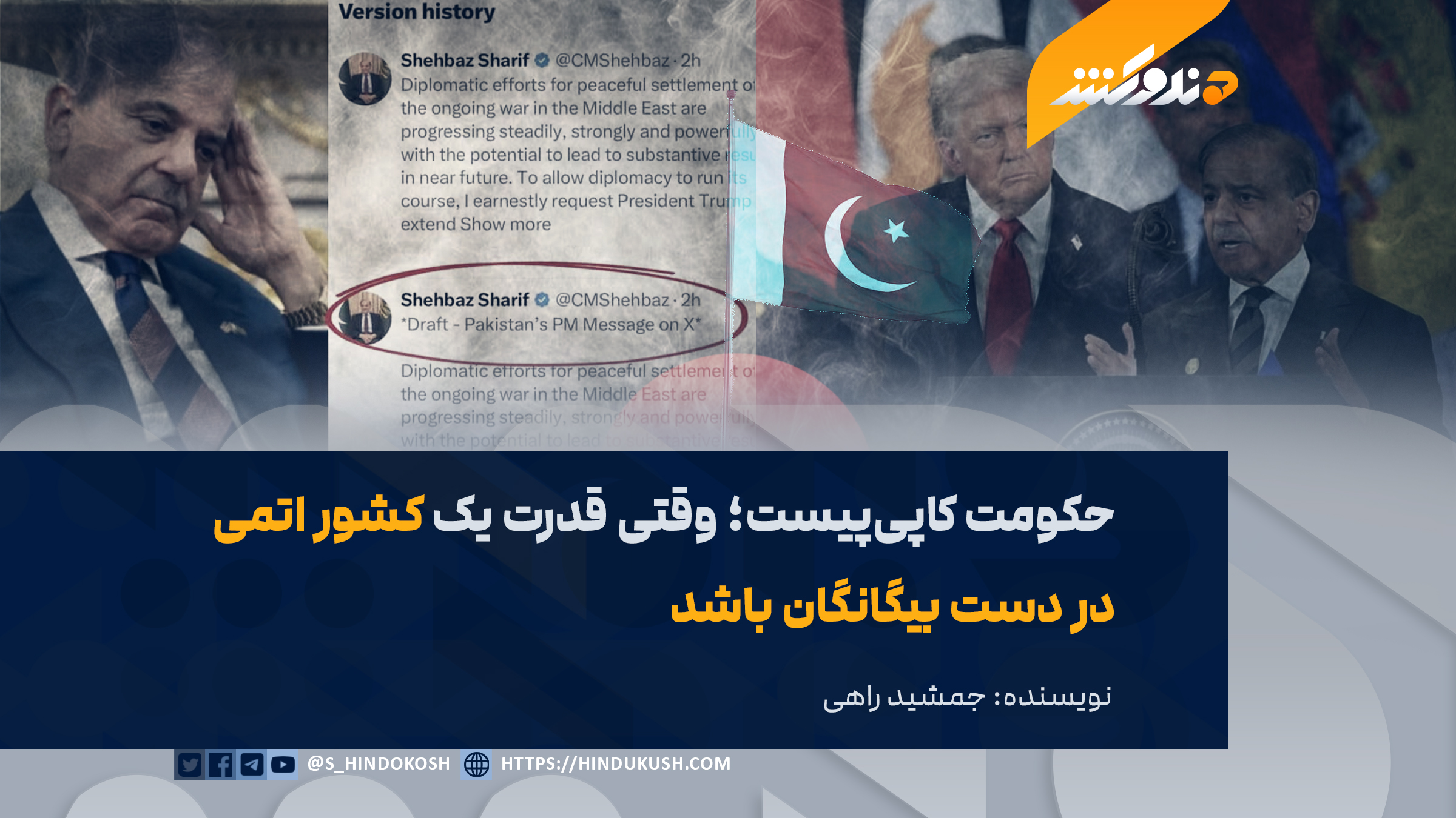 حقیقت پنهان پشت این توئیت زمانی آبروی باقی‌مانده پاکستان را در جهان بر باد داد که مشخص شد در مسوده (Draft) اولیه پیام نوشته شده بود: «مسوده – پیام صدراعظم پاکستان در ایکس (X)». این یک اشتباه تخنیکی کوچک نبود، بلکه افشای یک جنایت بزرگ بود که نشان می‌دهد مقامات نشسته در اسلام‌آباد، صاحب افکار خود نیستند؛ بلکه در آنجا صرفاً «سناریوهایی» که از واشنگتن و شاید تل‌ابیب آمده است، کاپی، پیست و نشر می‌شود.