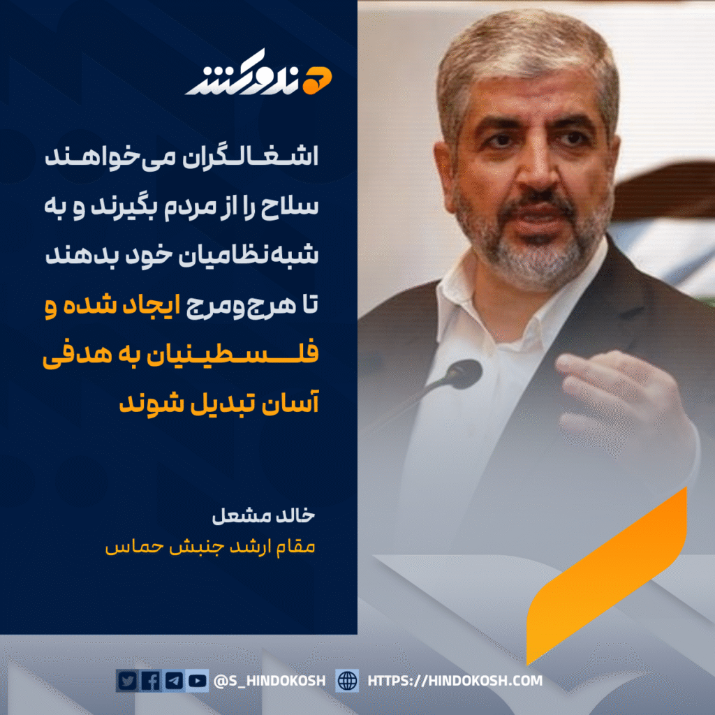 خالد مشعل، مقام ارشد جنبش حماس: اشغالگران می‌خواهند سلاح را از مردم بگیرند و به شبه‌نظامیان خود بدهند تا هرج‌ومرج ایجاد شده و فلسطینیان به هدفی آسان تبدیل شوند