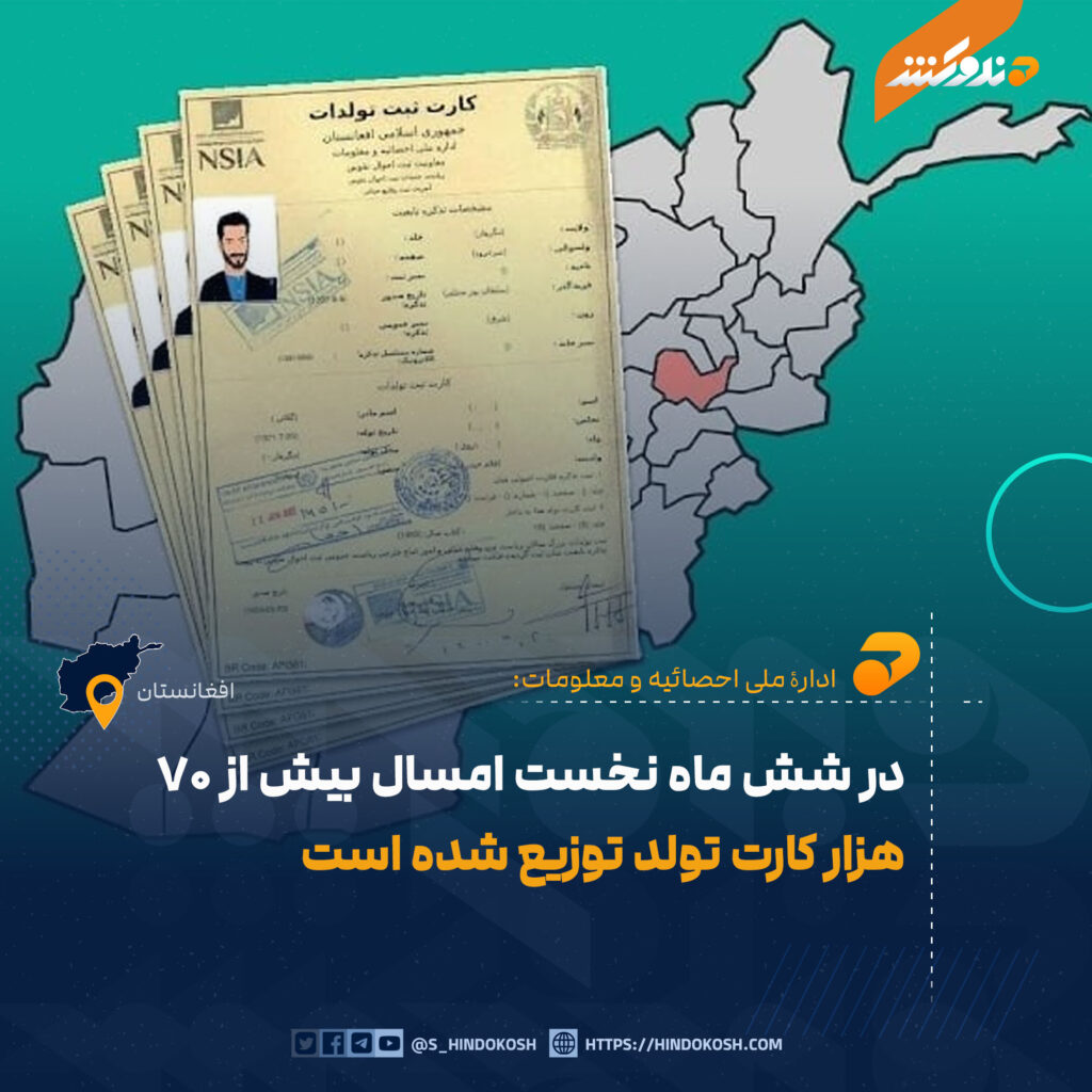 ادارۀ ملی احصائیه و معلومات اعلام کرده است که در شش ماه نخست سال ۱۴۰۴ هجری خورشیدی، در سراسر کشور در مجموع ۷۰ هزار و ۱۹۲ کارت تولد توزیع شده که از این میان ۴۶ هزار و ۴۹۳ برای بزرگسالان و ۲۳ هزار و ۶۹۹ برای کودکان بوده است.