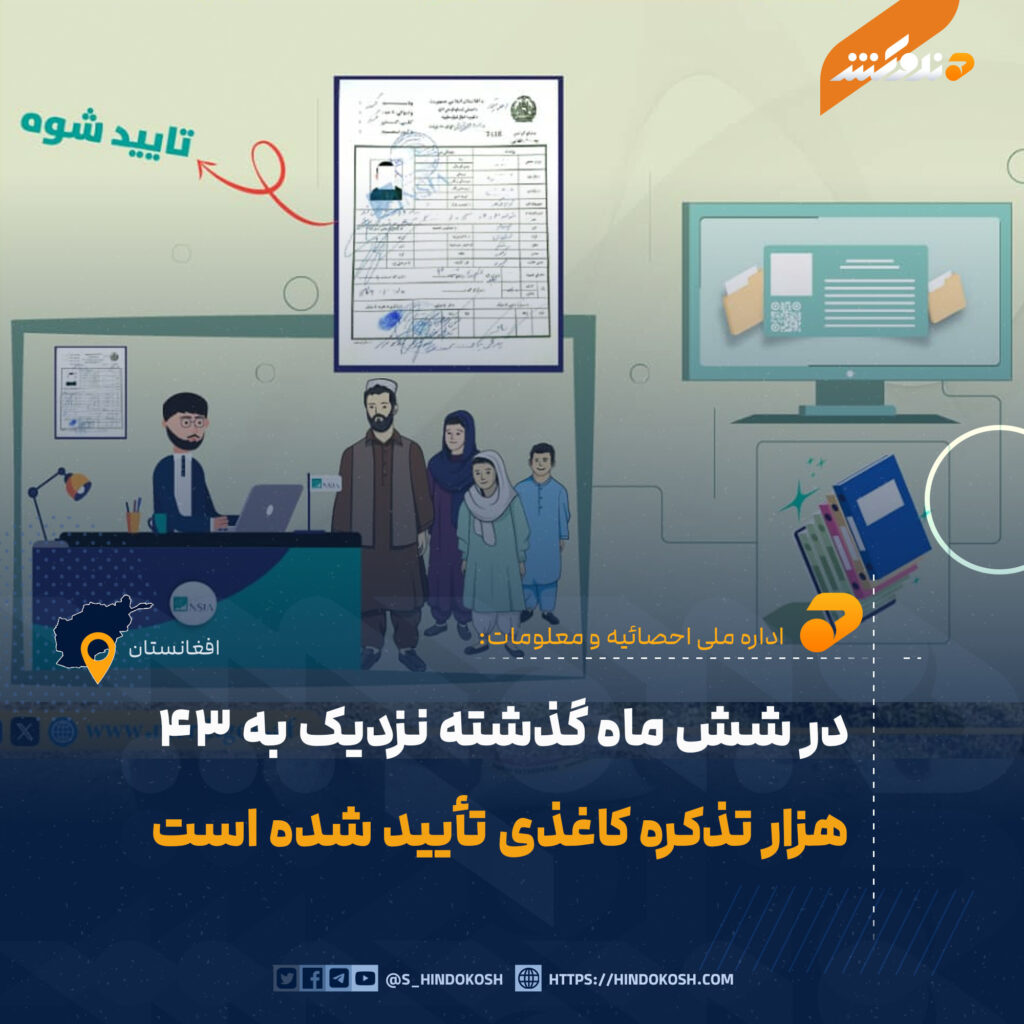 اداره ملی احصائیه و معلومات اعلام کرده است که در شش ماه اول سال جاری، ۴۲ هزار و ۷۳۹ تذکره کاغذی را تأیید کرده است.