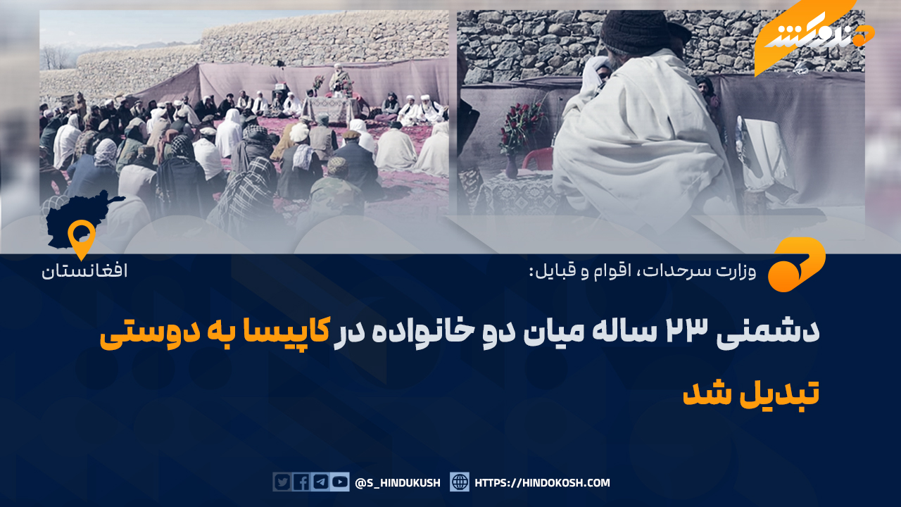 وزارت سرحدات، اقوام و قبایل اعلام کرده است که در ولسوالی تگاب ولایت کاپیسا، دشمنی ۲۳ ساله میان دو خانواده که بر اثر اختلافات خانوادگی به وجود آمده بود، روز گذشته طی یک جرگه قومی حل شد و به دوستی تبدیل گردید.