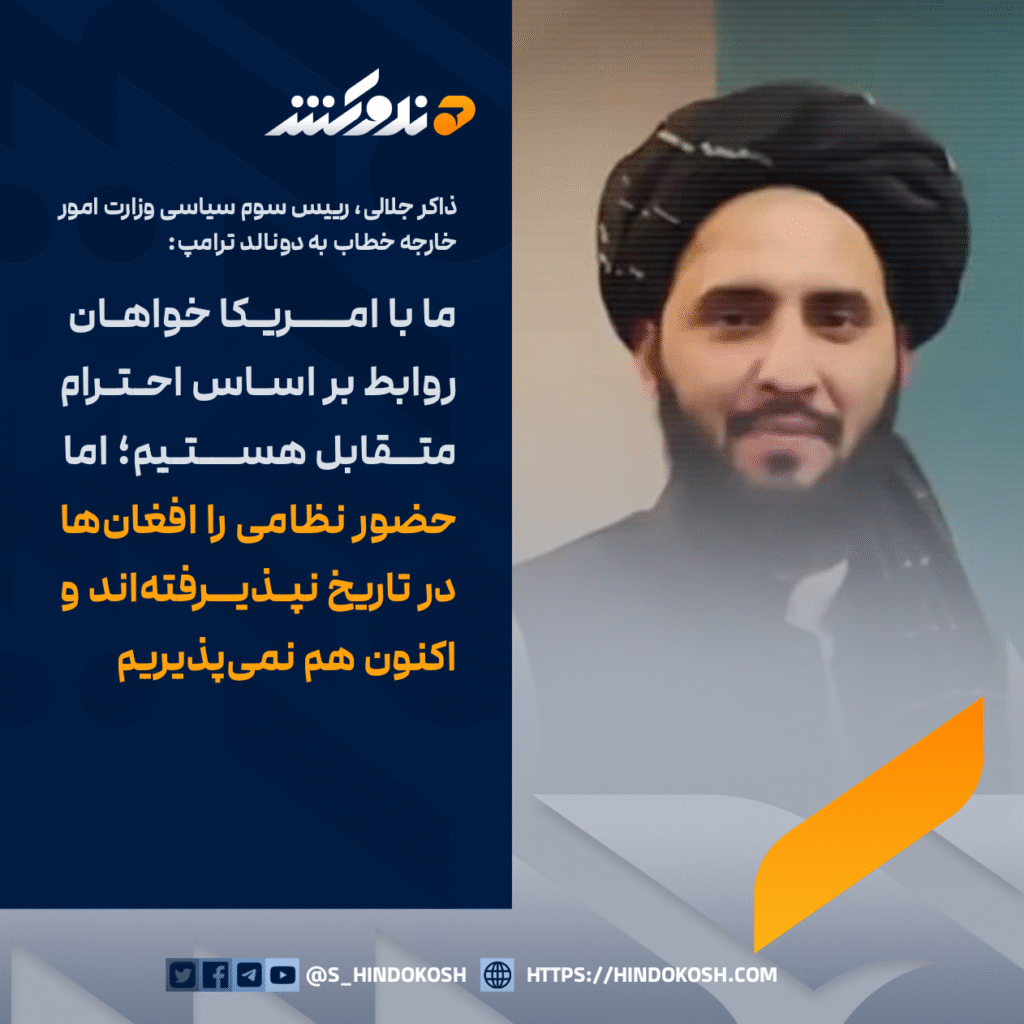 ذاکر جلالی، رییس سوم سیاسی وزارت امور خارجه خطاب به دونالد ترامپ: ما با امریکا خواهان روابط بر اساس احترام متقابل هستیم؛ اما حضور نظامی را افغانها در تاریخ نپذیرفتهاند و اکنون هم نمیپذیریم.