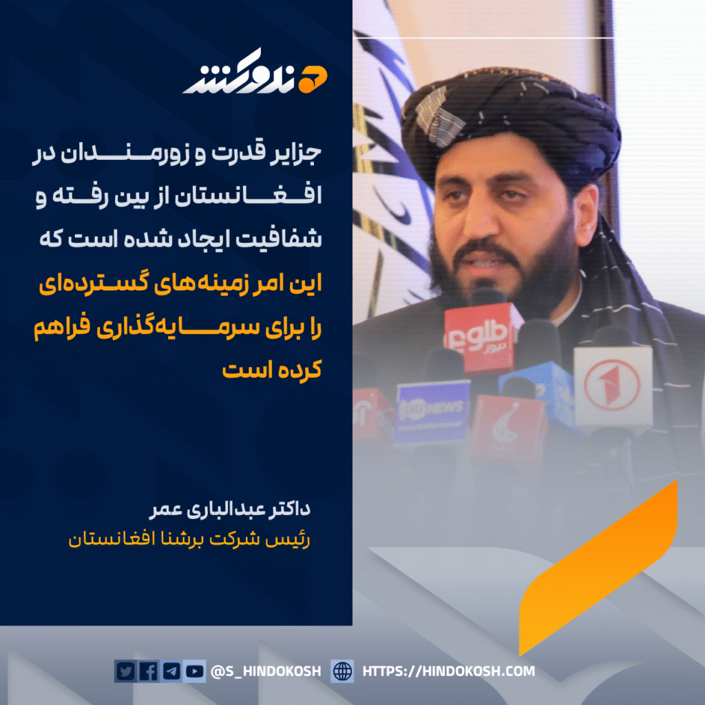 رئیس شرکت برشنا افغانستان، داکتر عبدالباری عمر: جزایر قدرت و زورمندان در افغانستان از بین رفته و شفافیت ایجاد شده است که این امر زمینههای گستردهای را برای سرمایهگذاری فراهم کرده است