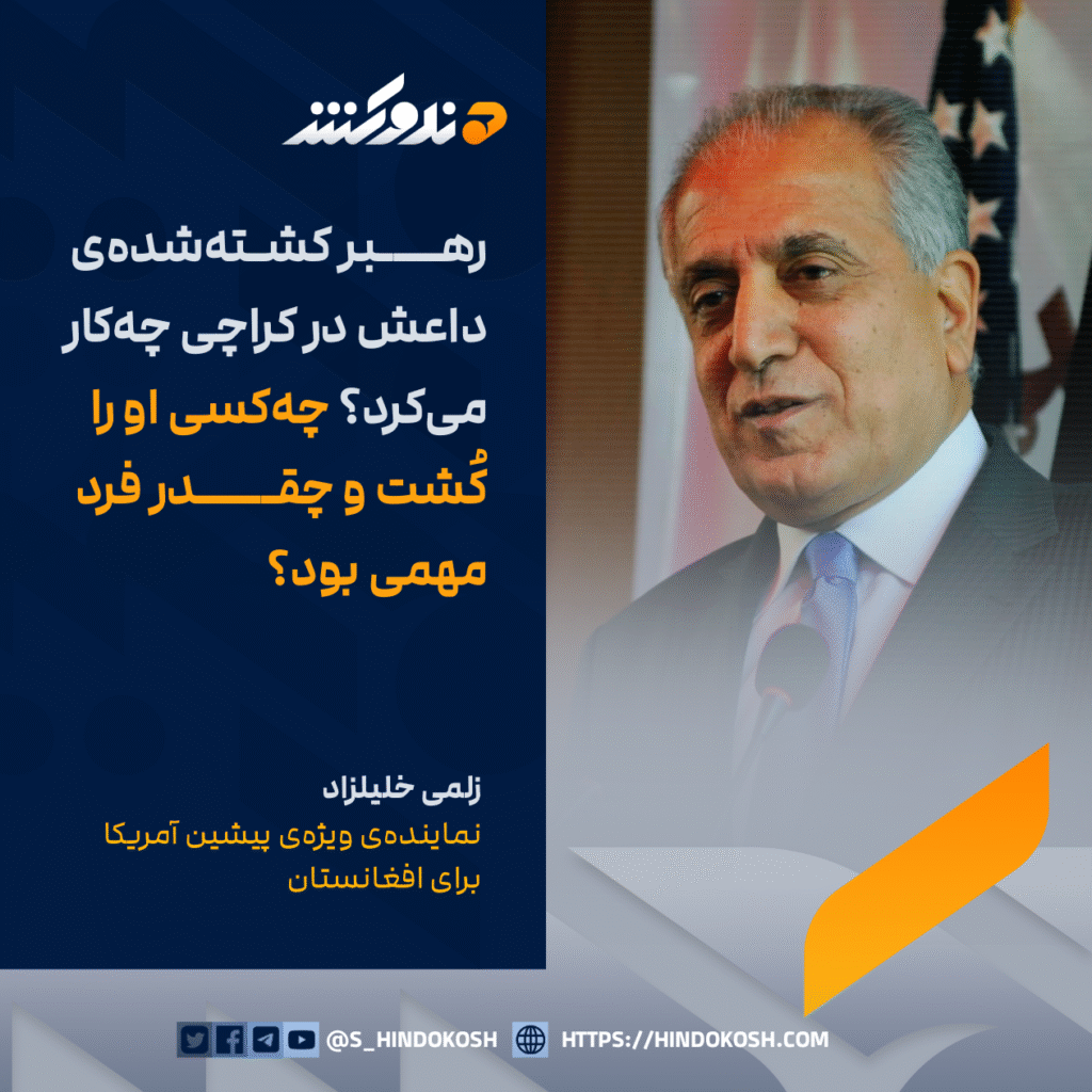 زلمی خلیلزاد، نماینده‌ی ویژه‌ی پیشین آمریکا برای افغانستان، در صفحه‌ی ایکس (X) خود، در مورد کشته شدن حسن، یکی از رهبران گروه داعش خراسان، توسط افراد مسلح ناشناس در کراچی پاکستان، چندین پرسش را مطرح کرده و انگشت شک به سوی پاکستان دراز کرده است.