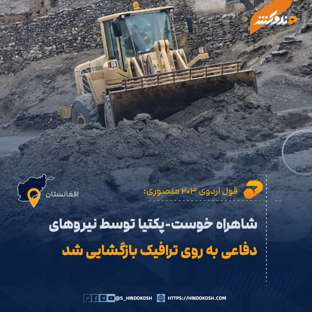 نیروهای قول اردوی ۲۰۳ منصوری، شاهراه عمومی خوست-پکتیا را که بر اثر سرازیر شدن سیلاب‌های اخیر و لغزش کوه مسدود شده بود، به روی ترافیک باز کردند.