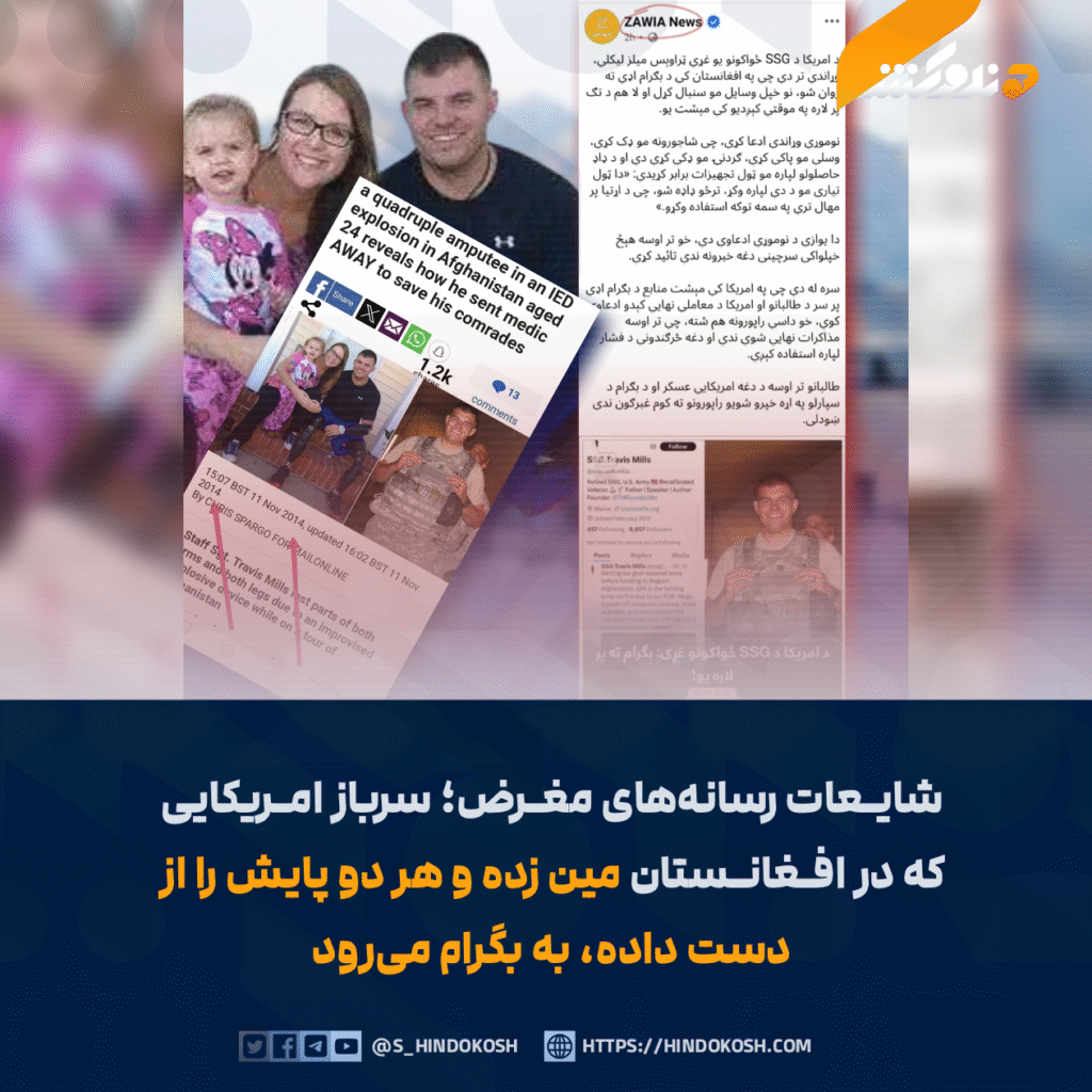 از صبح امروز به اینسو، شماری از گردانندگان حسابهای مغرض فیسبوک از جمله «زاویه نیوز» که خود را رسانه مینامند، با نشر تصویر یک سرباز امریکایی به نام «Travis Mills» غوغا به پا کردهاند که گویا سربازان امریکایی در راه بگرام اند.
