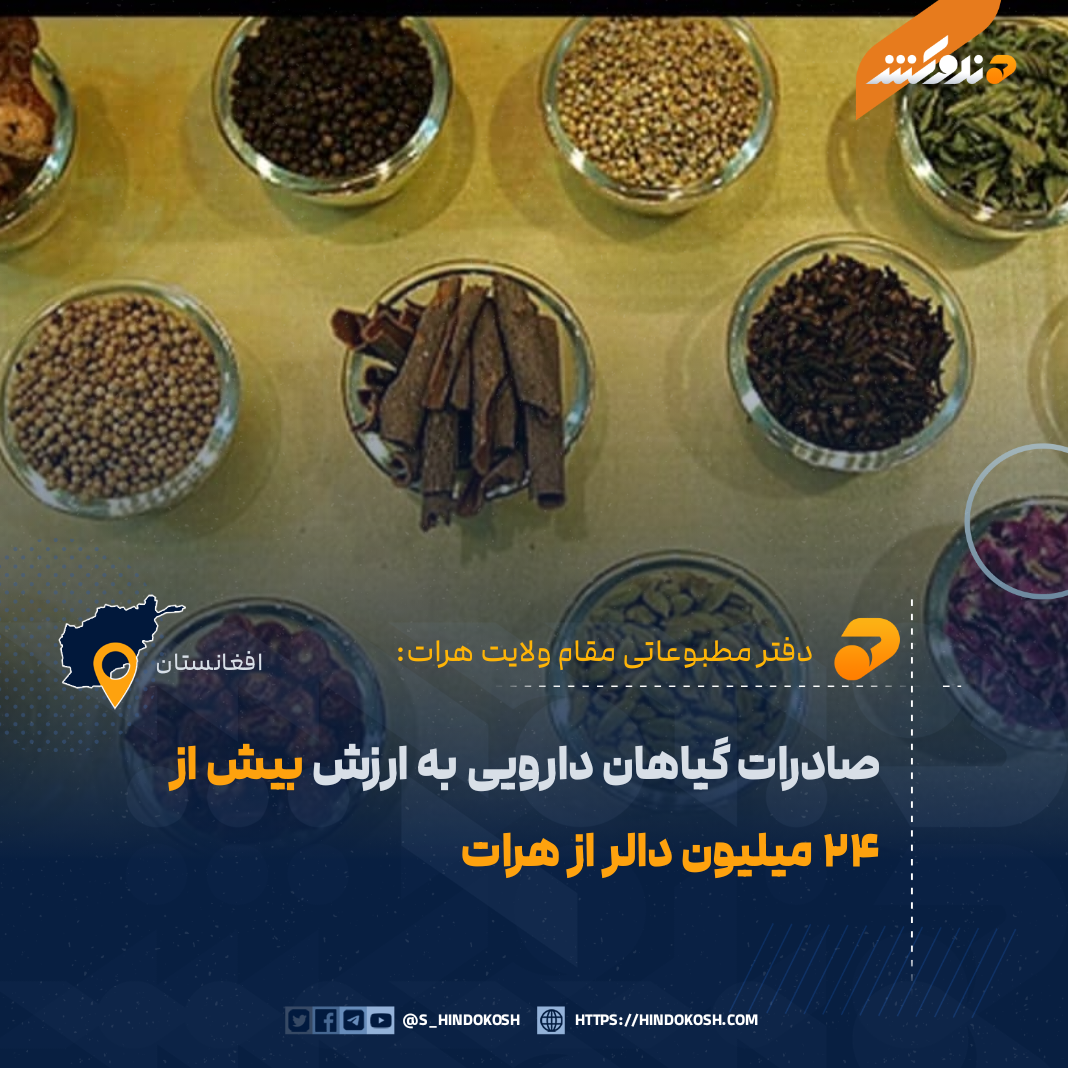 دفتر مطبوعاتی مقام ولایت هرات اعلام کرده است که در نه ماه نخست سال جاری (۱۴۰۴ هجری شمسی)، گیاهان دارویی به ارزش ۲۴ میلیون و ۲۶۸ هزار دالر آمریکایی از طریق این ولایت به کشورهای خارجی صادر شده است.