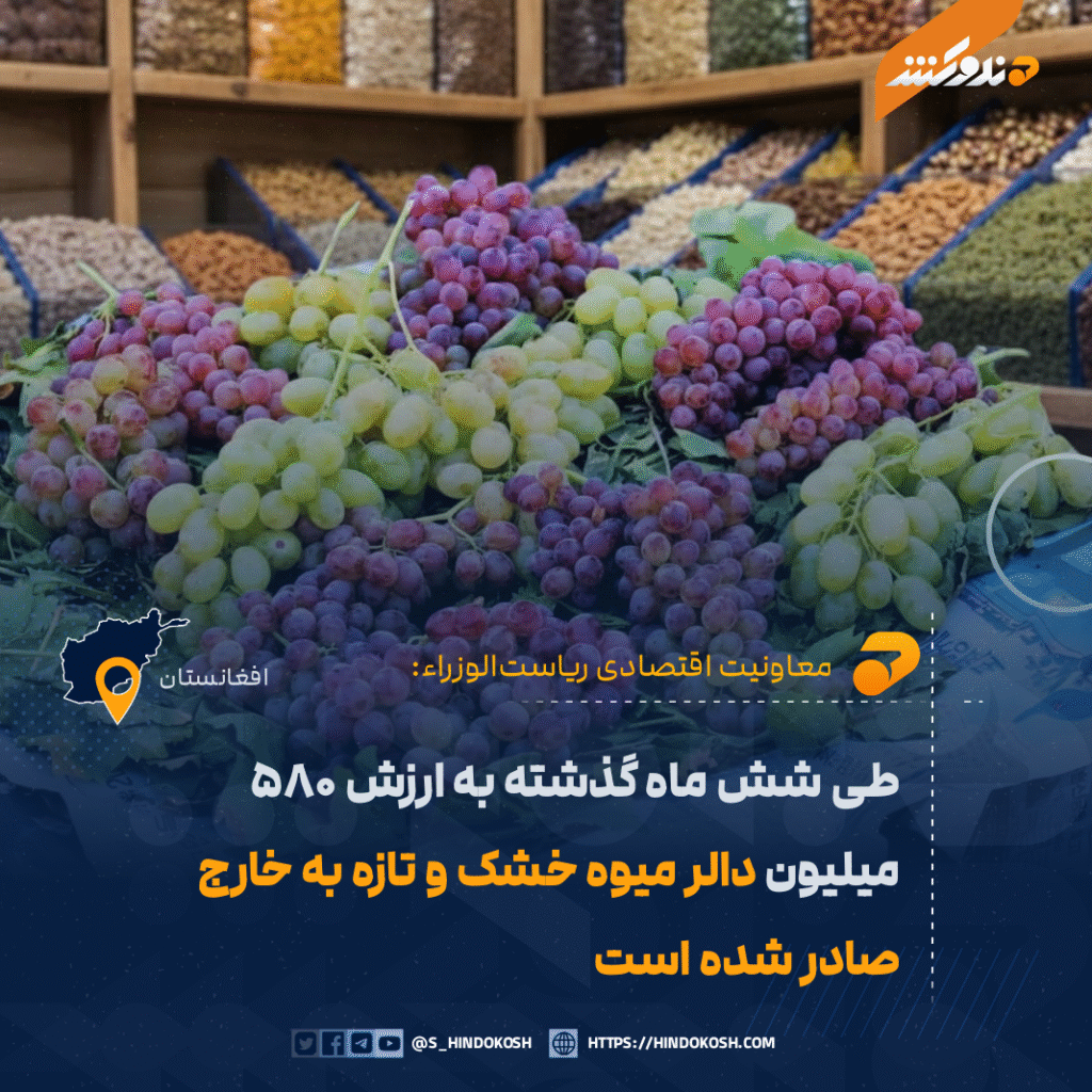 معاونیت اقتصادی ریاست‌الوزراء می‌گوید که در شش ماه نخست سال جاری، به ارزش ۵۸۰ میلیون دالر میوه‌های خشک و تازه به ارزش به کشورهای خارجی صادر شده است.