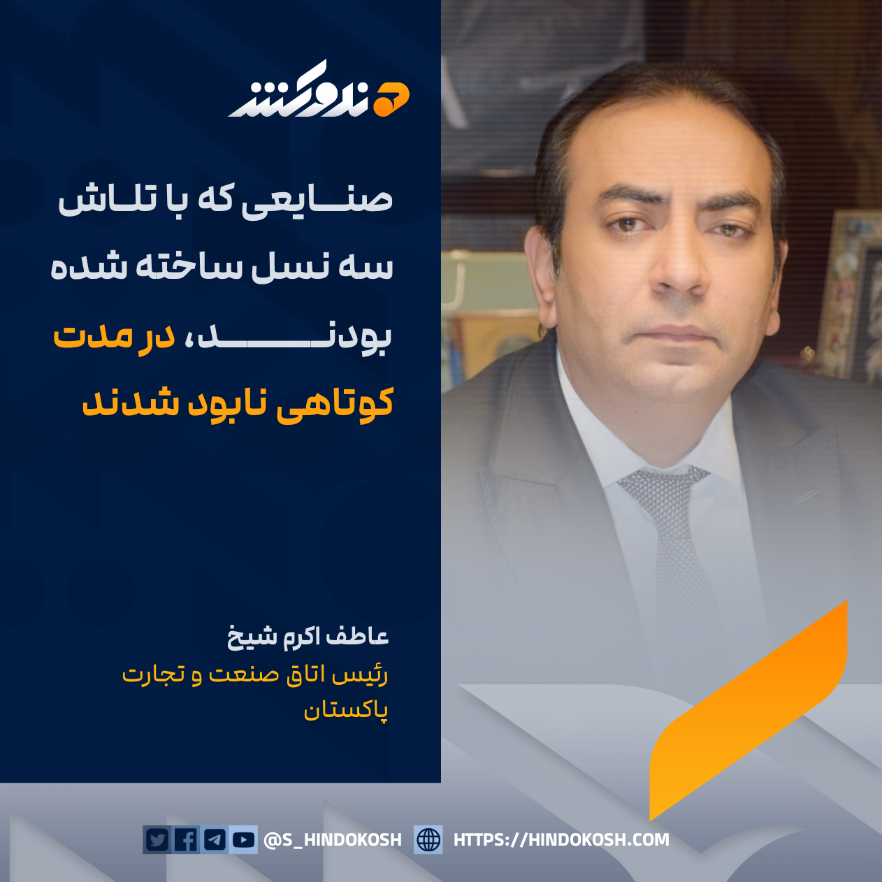 عاطف اکرم شیخ رئیس جدید اتاق صنعت و تجارت پاکستان، در تازهترین اظهارات خود به رژیم پاکستان هشدار داده که صنایعی که با تلاش سه نسل ساخته شده بودند، از بین رفتهاند.