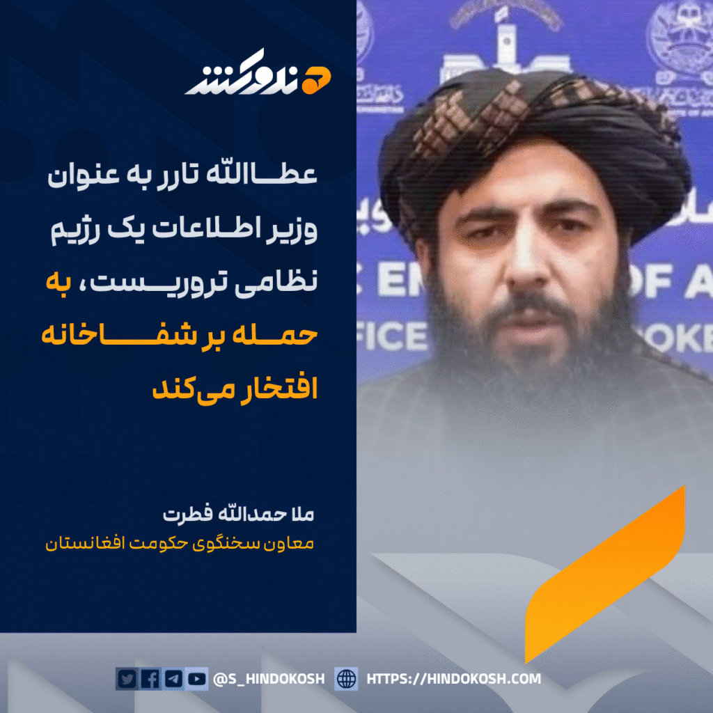 ملا حمدالله فطرت، معاون سخنگوی حکومت افغانستان: عطاالله تارر به عنوان وزیر اطلاعات یک رژیم نظامی تروریست، به حمله بر شفاخانه افتخار میکند