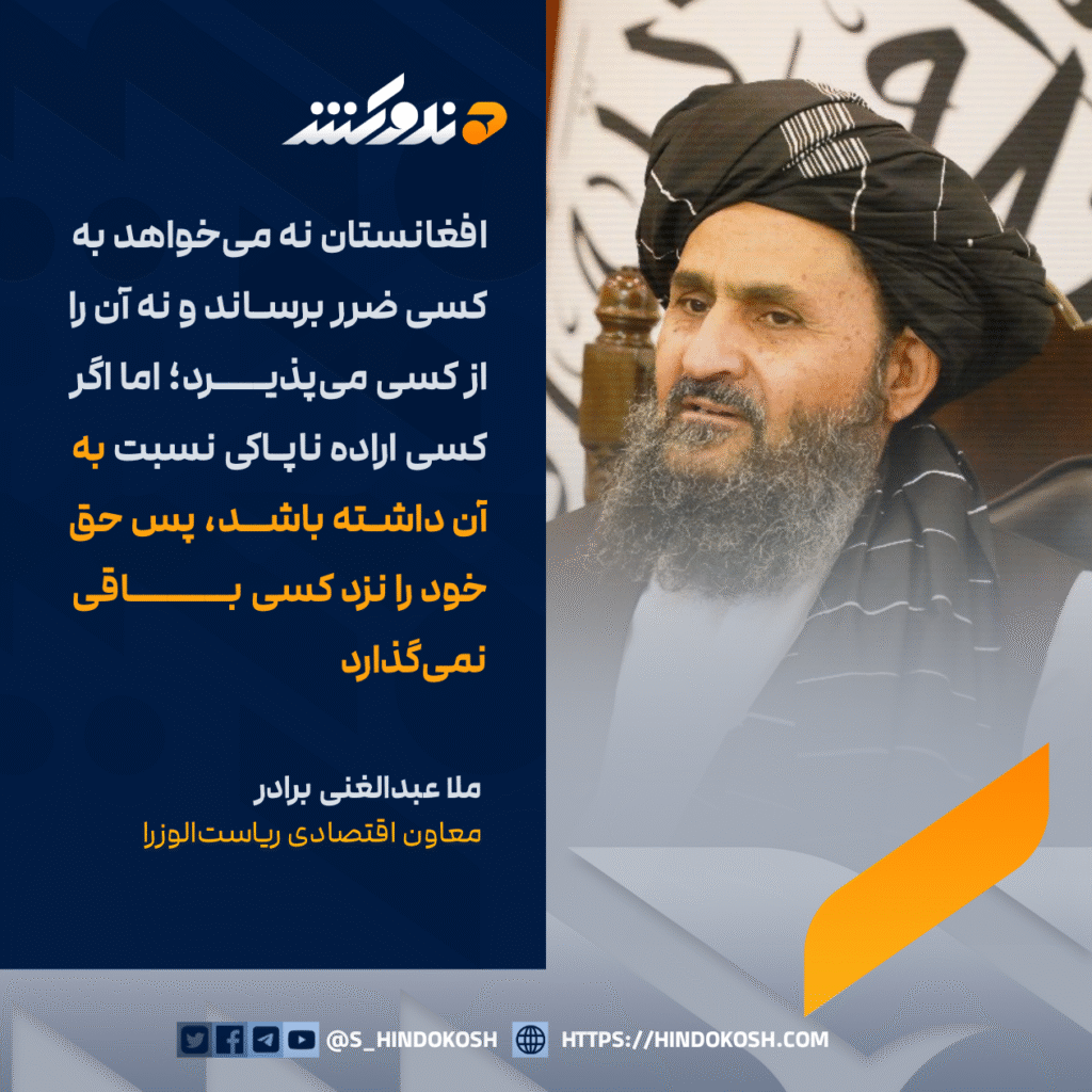 ملا عبدالغنی برادر، معاون اقتصادی ریاستالوزرا: افغانستان نه میخواهد به کسی ضرر برساند و نه آن را از کسی میپذیرد؛ اما اگر کسی اراده ناپاکی نسبت به آن داشته باشد، پس حق خود را نزد کسی باقی نمیگذارد