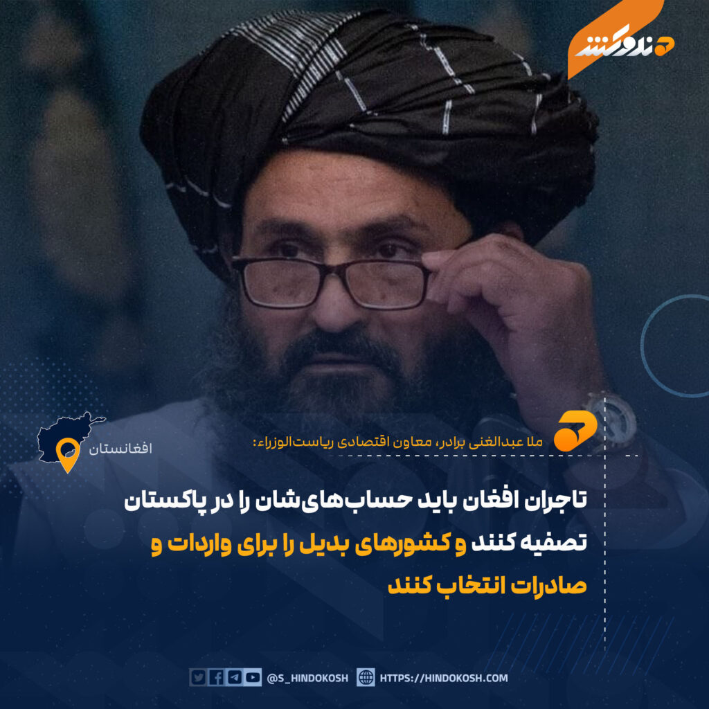 ملا عبدالغنی برادر، معاون اقتصادی ریاستالوزراء به تاجران افغان توصیه کرده است که هر چه زودتر حسابهای شان را در پاکستان تصفیه کنند و به جای این کشور، کشورهای جایگزین را برای صادرات و واردات انتخاب کنند.