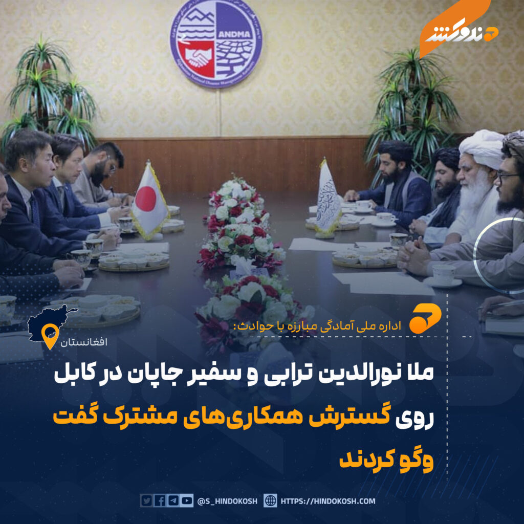 رئیس عمومی اداره ملی آمادگی مبارزه با حوادث ملا نورالدین ترابی، و سفیر جاپان در کابل، تاکایوشی کورومیا، در یک دیدار روی گسترش همکاریهای مشترک بحث و گفتوگو کردند.