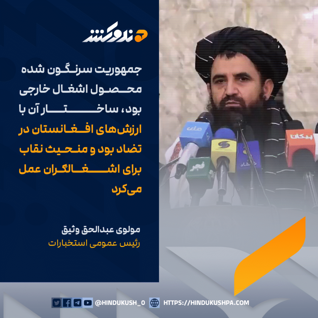 مولوی عبدالحق رئیس عمومی ریاست عمومی استخبارات گفته است که جمهوریت سرنگونشده در ۲۰۲۱ توسط ا.ا.ا محصول استعمار خارجی بوده و ساختار و ارزشهای سیاسی آن با عقاید و ارزشهای مردم افغانستان در تضاد بود.