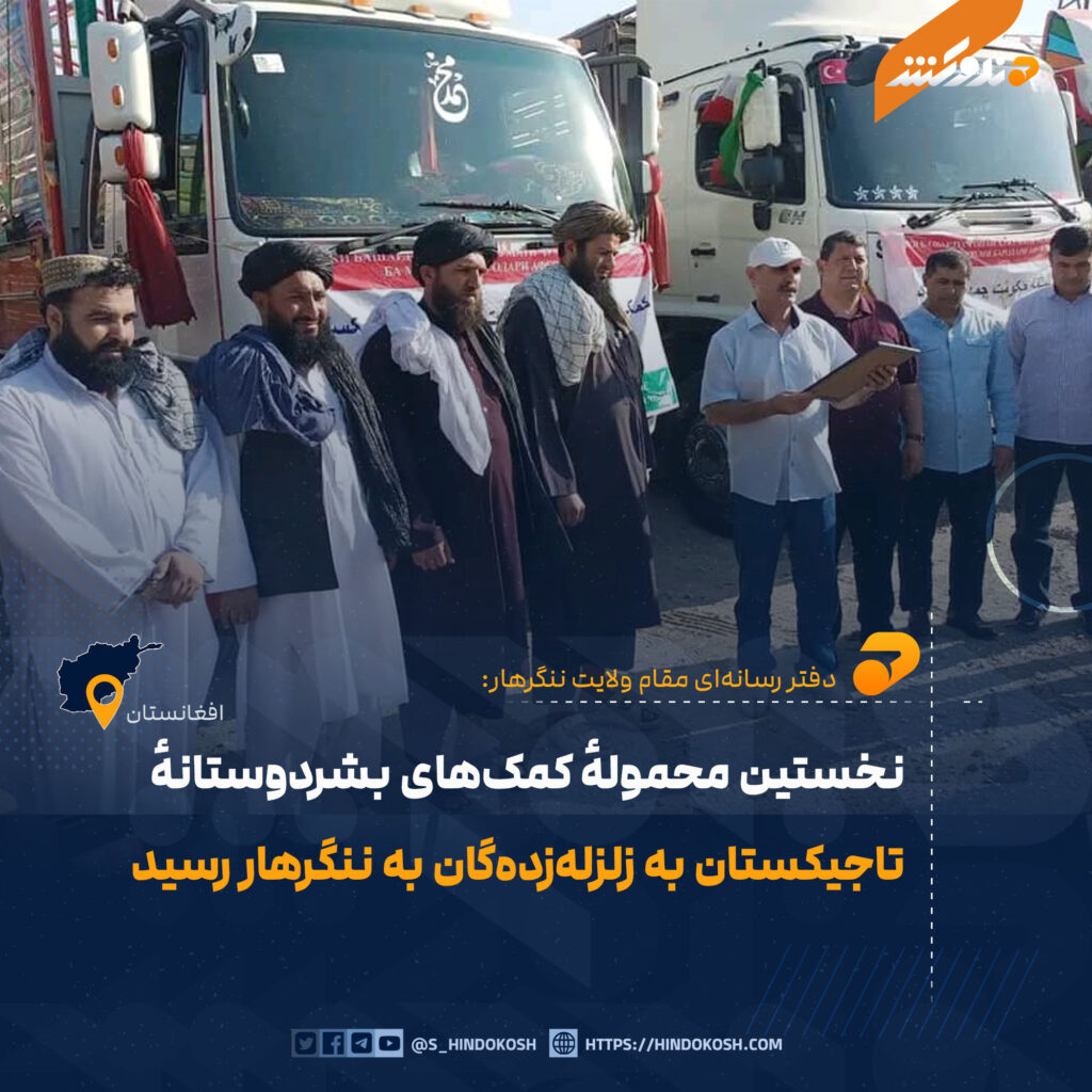 دفتر رسانهای مقام ولایت ننگرهار خبر داده است که نخستین محموله از کمکهای ۳۰۰۰ تُنی ساختمانی، خوراکی و غیرخوراکی تاجیکستان در نه عراده موتر به ننگرهار رسیده است.
