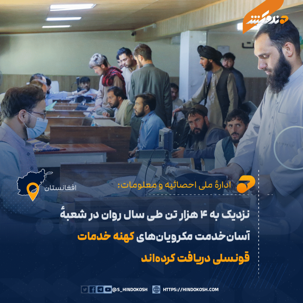 ادارهٔ ملی احصائیه و معلومات می‌گوید که از آغاز سال ۱۴۰۴ تا کنون، ۳۹۰۷ تن در شعبهٔ آسان‌خدمت مکرویان‌های کهنهٔ شهر کابل، خدمات قونسلی مربوط به وزارت امور خارجه را دریافت کرده‌اند.