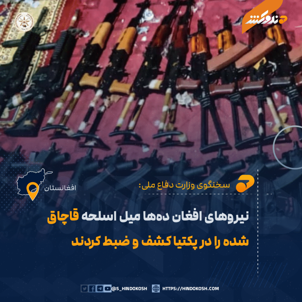 عنایت‌الله خوارزمی، سخنگوی وزارت دفاع ملی می‌گوید که نیروهای دفاعی افغان شب گذشته در ولسوالی دندپتان ولایت پکتیا، تعدادی از سلاح‌های قاچاق شده به کشور را کشف و ضبط کرده‌اند.