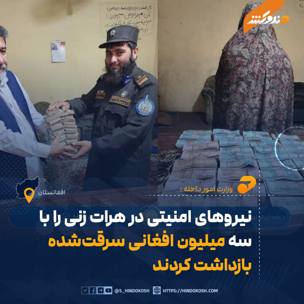پولیس قوماندانی امنیهٔ هرات اعلام کرده‌اند که در مربوطات حوزهٔ نهم امنیتی شهر هرات، زنی را همراه با سه میلیون افغانی سرقت‌شده بازداشت کرده‌اند.