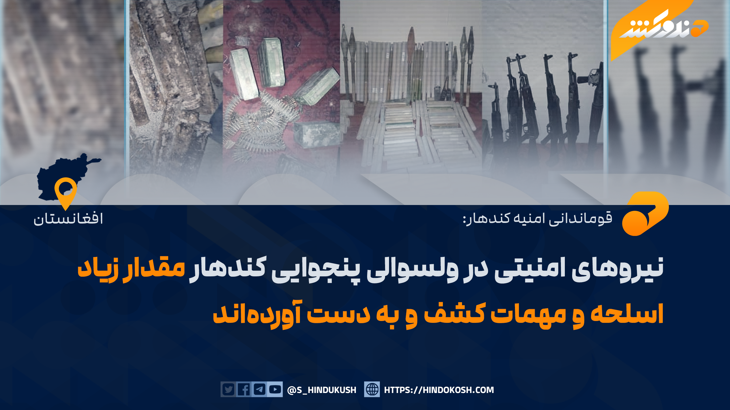 دفتر مطبوعاتی قوماندانی امنیه کندهار خبر داده که نیروهای امنیتی این ولایت در نتیجه یک سلسله عملیات کشفی، مقدار زیاد اسلحه و مهمات را در منطقه صلاوات ولسوالی پنجوایی کشف و به دست آورده‌اند.