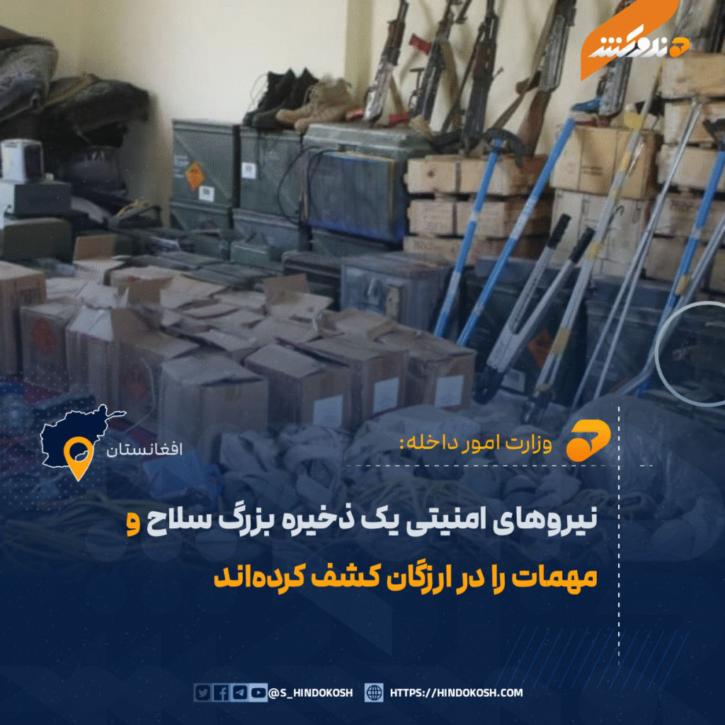 وزارت امور داخله می‌گوید که منسوبان قوماندانی امنیه ولایت ارزگان یک ذخیره سلاح و مهمات را در خانه یکی از مقامات حکومت سرنگون‌شده جمهوریت در منطقه «تالانی» مربوط شهر ترینکوت کشف و به‌دست آورده‌اند.