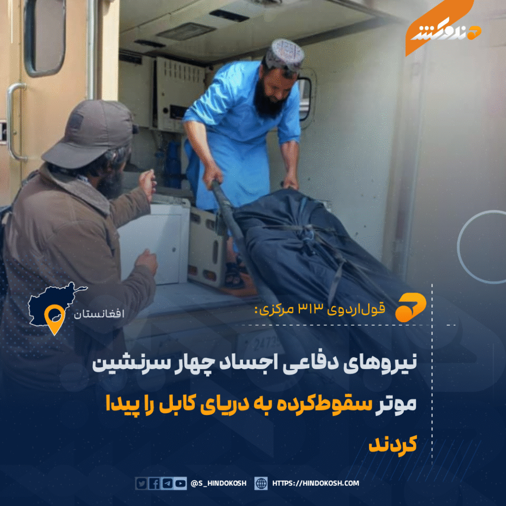 منسوبین لوای سوم قولاردوی ۳۱۳ مرکزی، اجساد چهار سرنشین یک موتر کرولا را که در مسیر شاهراه کابل-جلالآباد به دریای کابل سقوط کرده بود، از آب بیرون کشیدند.