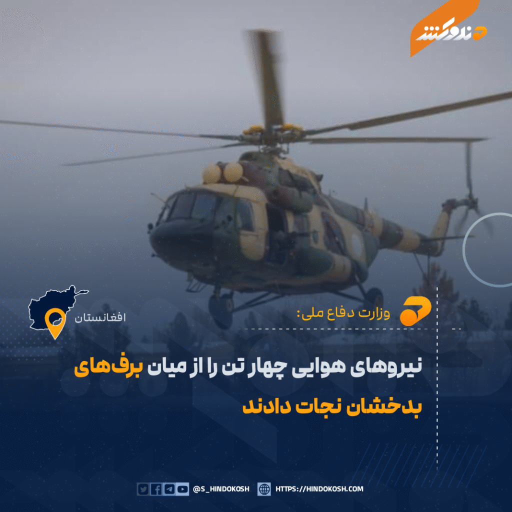 وزارت دفاع ملی می‌گوید که چهار تن که در برف‌های منطقه «شیوا» در ولسوالی ارغنجخواه ولایت بدخشان گیر مانده بودند، توسط نیروهای هوایی کشور با موفقیت نجات یافتند.