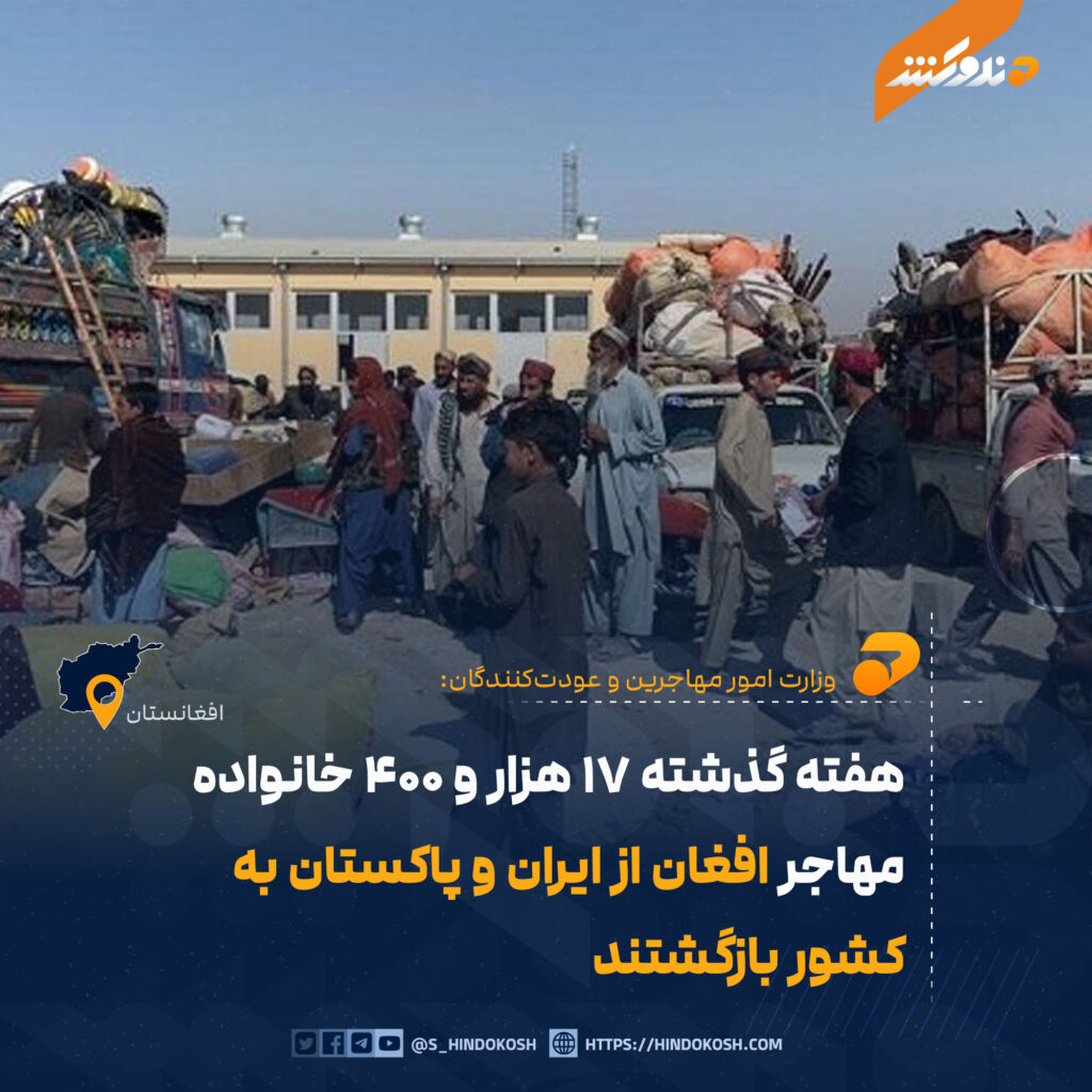 مسئولان وزارت امور مهاجرین و عودتکنندگان اعلام کردهاند که در یک هفته گذشته، ۱۷ هزار و ۴۰۰ خانواده مهاجر افغان از ایران و پاکستان به کشور بازگشتهاند.