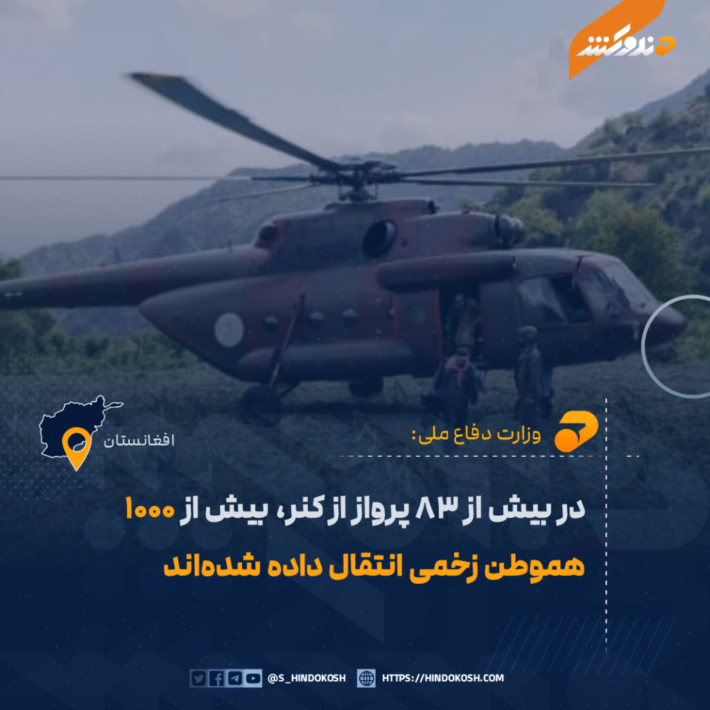 وزارت دفاع ملی: در بیش از ۸۳ پرواز از کنر، بیش از ۱۰۰۰ هموطن زخمی انتقال داده شدهاند