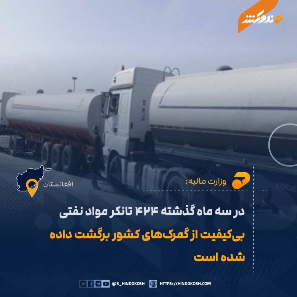 وزارت مالیه با نشر خبرنامه‌ای اعلام کرده است که در جریان سه ماه گذشته، ۴۲۴ تانکر مواد نفتی بی‌کیفیت از گمرک‌های کشور بازگردانده شده است.