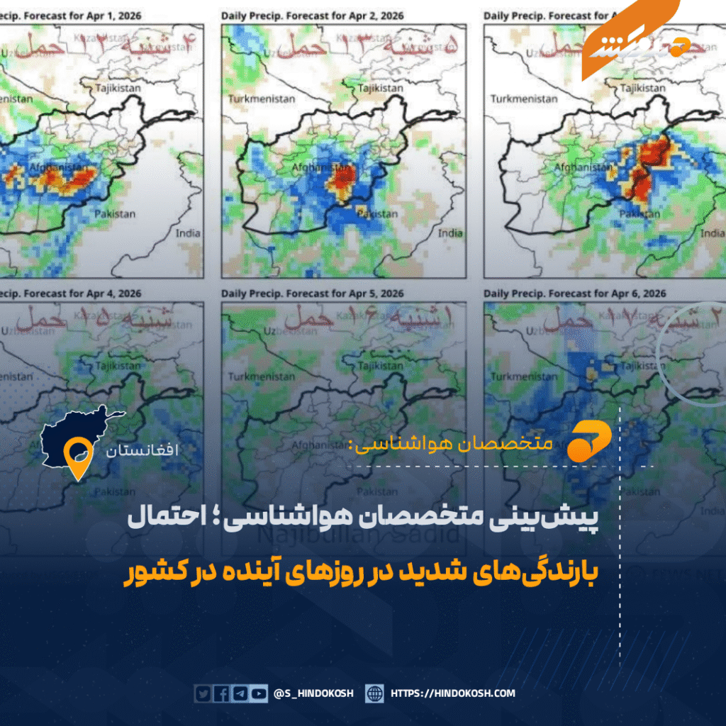 علاوه بر این، فردا (جمعه) در بخش‌های شرقی کشور از جمله ولایات کابل، پروان، کاپیسا، پنجشیر، غزنی، لوگر، میدان‌وردک، پکتیا، پکتیکا، خوست، ننگرهار، لغمان، کنر و نورستان، بارندگی روزانه تا ۷۵ میلی‌متر پیش‌بینی شده که ممکن است منجر به وقوع سیلاب‌های شدید شود.