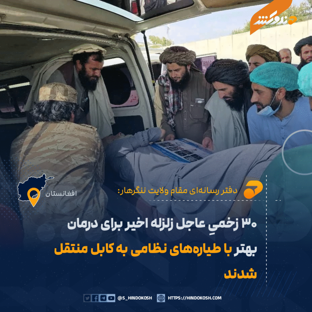 دفتر رسانهای مقام ولایت ننگرهار خبر داده است که شماری از زخمیانی که در شفاخانه حوزهای ننگرهار تداوی ابتدایی شده بودند، برای درمان بهتر با طیارههای بزرگ به پایتخت، کابل منتقل شدند.