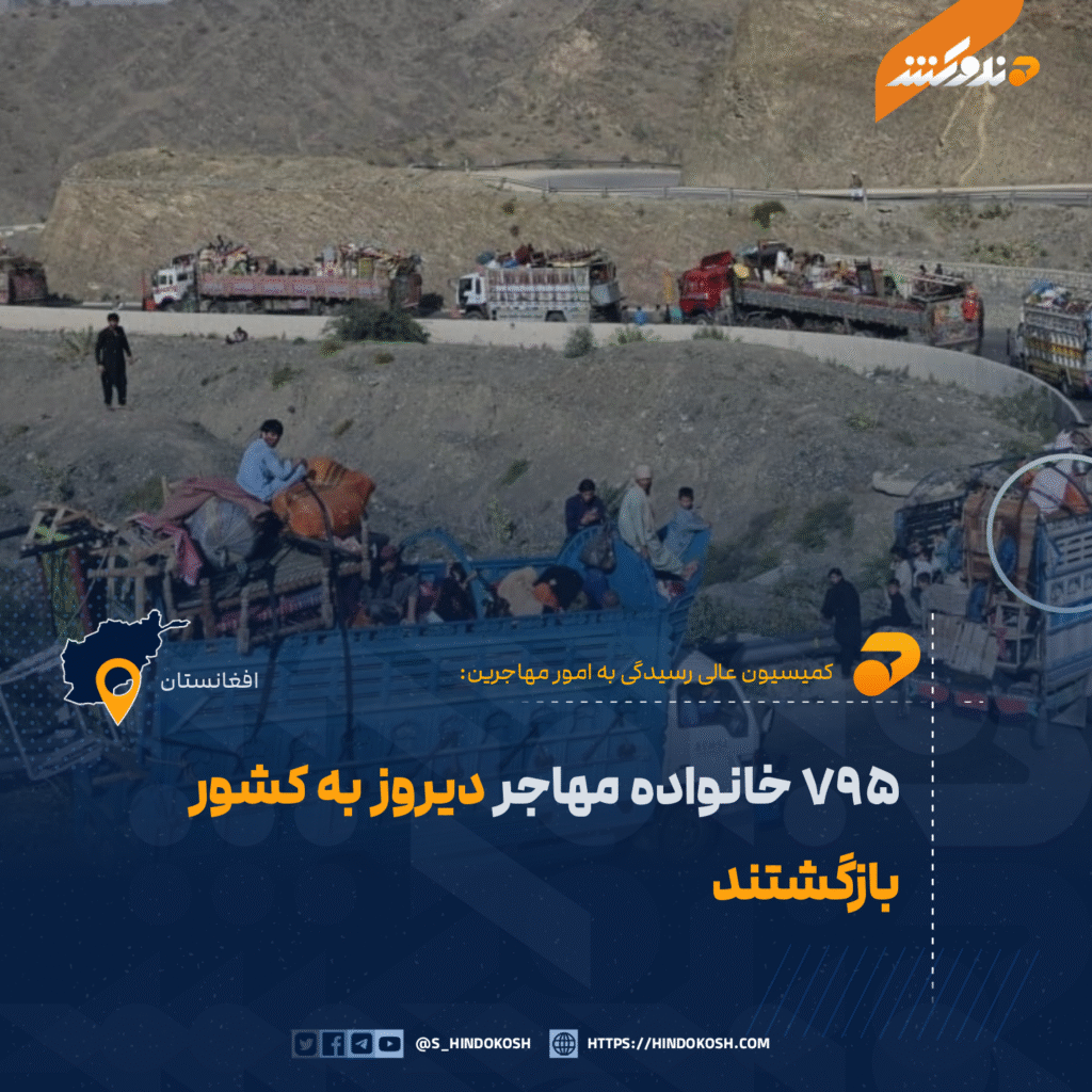 مسئولان کمیسیون عالی رسیدگی به امور مهاجرین اطلاع دادند که دیروز از ایران و پاکستان ۷۹۵ خانواده به کشور بازگشته‌اند.
